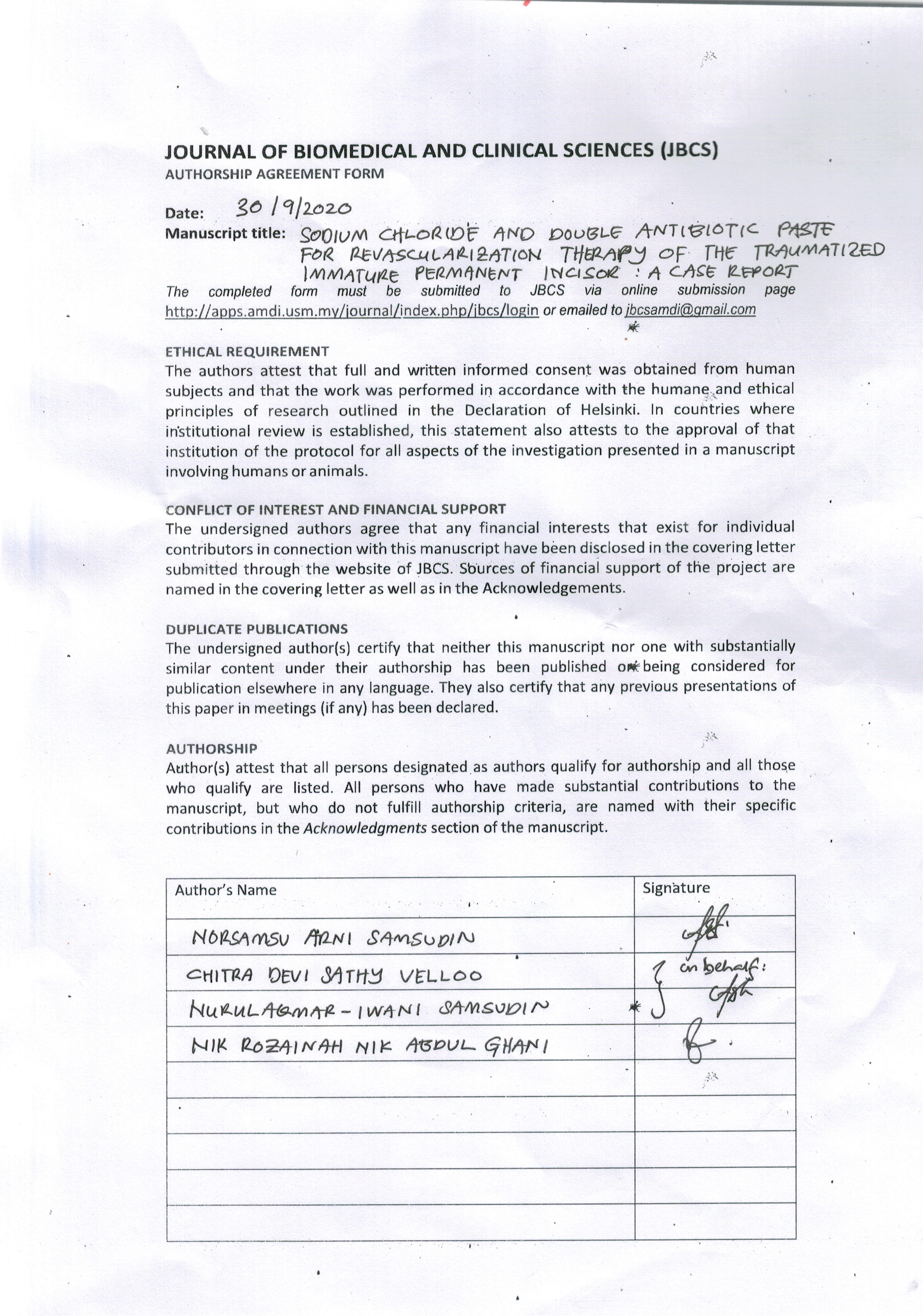 Nagaveni N, Poornima P, Khan M. A Comparative Evaluation of Revascularization Done in Traumatized Immature, Necrotic Anterior Teeth with and without Platelet-rich Fibrin:A Case Report. Int J Clin Pediatr Dent. 2020;13(1):98–102.